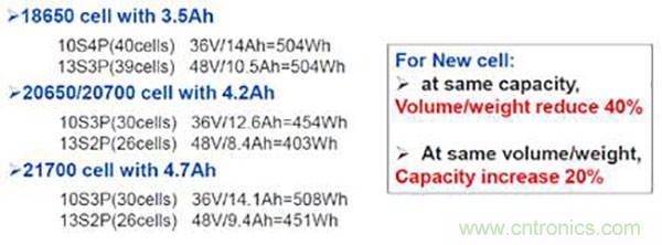 采用20700 /21700 /20650后,由于同等能量下,電池數(shù)量減少(以21700為例,減少1 /3),這會帶來整個Pack內(nèi)部金屬連接件數(shù)量的減少,這會進(jìn)一步降低電池Pack的質(zhì)量。