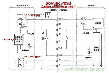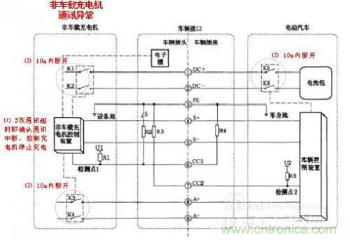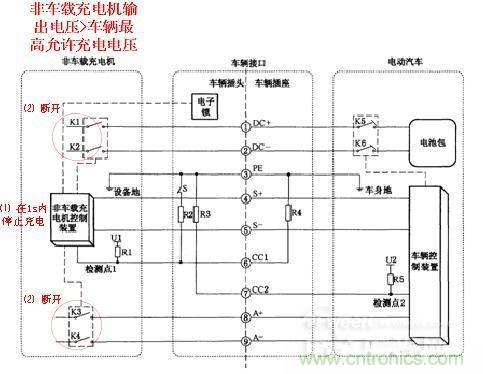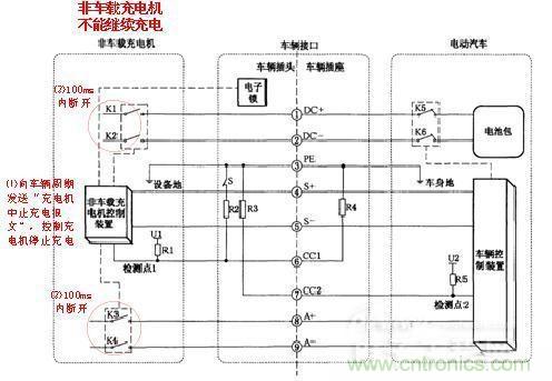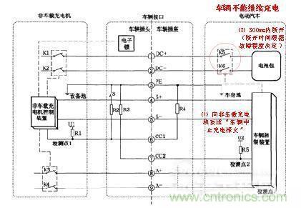 2)在充電過(guò)程中,非車載充電機(jī)控制裝置通過(guò)對(duì)檢測(cè)點(diǎn)1的電壓進(jìn)行檢測(cè),如果判斷車輛接口由完全連接變?yōu)閿嚅_(kāi)(如車輛意外移動(dòng)、充電槍線纜被意外擾動(dòng)等),則控制非車載充電機(jī)停止充電,應(yīng)在100ms內(nèi)斷開(kāi)K1、K2、K3、K4。