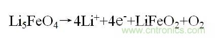 Xin Su等針對(duì)Li5FeO4作為正極鋰源開展了相關(guān)研究,他們正極采用了LiCoO2(庫倫效率為98%),負(fù)極采用了硬碳(首次庫倫效率僅有80%左右),Li5FeO4采用固相法合成。在首次充電的過程中,LFO材料能至少釋放出4個(gè)Li+,相當(dāng)于比容量為700mAh/g以上,如下面反應(yīng)方程所示: