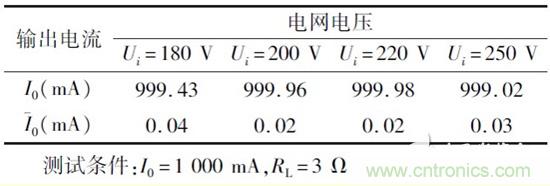 電源穩(wěn)定度測(cè)試數(shù)據(jù)如表1 所示。其中電源穩(wěn)定度是指在容許電網(wǎng)波動(dòng)范圍條件下,對(duì)輸出電流穩(wěn)定度的影響。測(cè)試條件為I0 =1 000 mA,RL =3Ω,測(cè)試數(shù)據(jù)表明電網(wǎng)電壓在180 V ~250 V 波動(dòng)時(shí),輸出電流最大偏差為0.99 mA,紋波電流小于0.05 mA,輸出電流和紋波電流均達(dá)到設(shè)計(jì)要求。