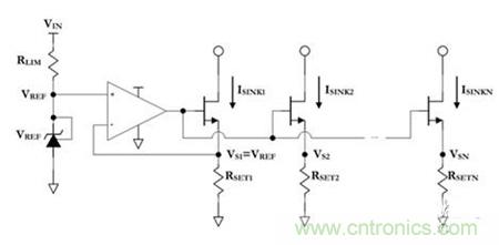 晶體管)源電壓VS以及RSET電阻決定著各柱上的灌電流(sink current);通過(guò)去除來(lái)自外部電流沉柱的反饋(即所有N》1),已失去對(duì)VSN的直接控制。因此,RSETN必須精心選擇以生成預(yù)期的任意第N個(gè)柱的灌電流,即ISINKN。仔細(xì)觀(guān)察上面的圖1,很容易得出定義偏置網(wǎng)絡(luò)第N個(gè)柱電流與第1個(gè)柱電流的比值的等式︰