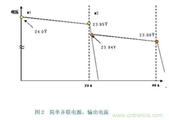 被動式均衡電流的并聯(lián)運(yùn)行模式特點是:當(dāng)輸出電流增大時,其輸出電壓會微量的減少,其輸出電壓是所謂的軟特性:輸出電壓隨著輸出電流的增加而稍微下降。其電源在空載到滿負(fù)載之間的輸出電壓的波動大約為4%~5%額定電壓即1V左右。這樣當(dāng)二個電源并聯(lián)時,由于不同的電流負(fù)載產(chǎn)生了不同的輸出電壓,一個是有稍高輸出的電壓的電源首先承受負(fù)載電流,隨著電流量的增加,這個電源輸出電壓略降,低于另一個電源的輸出電壓,這樣另一電源承受負(fù)載電流,通過這樣階梯式交替的方法達(dá)到均衡電流的作用。均衡電流的平衡程度如何,取決于所有并聯(lián)電源的輸出電壓的初始調(diào)節(jié)和設(shè)置值。必需指出,這個方法的實現(xiàn)其輸出電源必須采用一個共同的接線端。