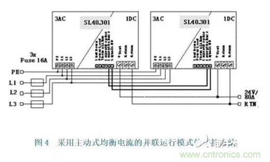主動式均衡電流的并聯(lián)模式必須采用一根附加的均流線,這根均流線作為反饋信號傳送到電源的控制器來調(diào)節(jié)每個電源在所有的條件下提供相同的輸出電流,這時,電源電壓輸出的軟特征是不需要的,輸出電壓在任何場合下不受電流大小的影響,所以與被動式均衡電流相比,其輸出電壓精度高,同時與輸出電路的類型無關(guān);但是對于開發(fā)和安裝來說,費(fèi)用較高,因為在電源內(nèi)部需要一個精確度較高的電流測試線路和一個附加的電流調(diào)節(jié)器,同時也多一個接線端口。PULS電源的SL40.301三相24/40A的電源采用這種技術(shù),所有的電源經(jīng)過均流線和地線相連接,如圖4所示。