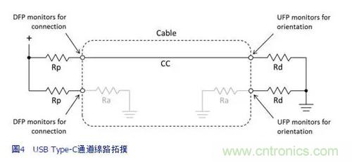 連接裝置之間的初始電力傳輸協(xié)議是透過(guò)一系列電阻器執(zhí)行,當(dāng)Type-C插頭插入插座時(shí),這些電阻器充當(dāng)CC線路上的分壓器。由于插頭中的CC線路會(huì)連接至插座中的CC1或CC2,因此插座只要測(cè)量CC1和CC2線路上的電壓,即可判定插頭的方向。上拉電阻的不同數(shù)值可傳達(dá)電源能夠提供的電流量,同時(shí)可確定UFP和DFP分別是什么。電力消耗裝置沒(méi)有辦法透過(guò)不同的下拉電阻值指出其消耗的電流量,而是必須不斷地調(diào)整其負(fù)載以符合電源供應(yīng)器可提供的最大電流。