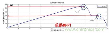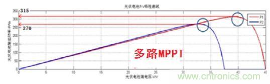 因?yàn)楣夥姵仃嚵惺菃挝还夥姵亟M串組成的,每個(gè)組串都有自己的工作電壓,電壓很大概率上不一致,如果以傳統(tǒng)的集中式方案的話,組串在匯流箱能量匯集時(shí)并聯(lián)會(huì)發(fā)生一次并聯(lián)失配,匯流箱到逆變器能量并聯(lián)時(shí)再發(fā)生一次并聯(lián)失配,嚴(yán)重影響光伏電池組件的發(fā)電效率。如下圖3所示,單路MPPT的情況下,光伏電池組件受到各種因素的影響,會(huì)導(dǎo)致出現(xiàn)兩個(gè)或多個(gè)波峰的情況,跟蹤到任何一個(gè)波峰都會(huì)對(duì)發(fā)電量造成損失。而如果多路MPPT的情況下,能精確跟蹤到每一個(gè)組串的特性,形成多條MPPT曲線,使得每串光伏電池組串最大效能的發(fā)揮作用。