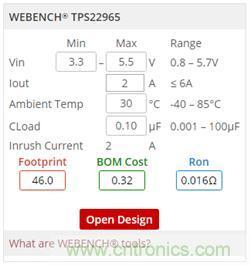 負(fù)載開關(guān)WEBENCH功能可通過(guò)產(chǎn)品頁(yè)面右側(cè)的WEBENCH組件實(shí)現(xiàn)。圖2顯示了TPS22965負(fù)載開關(guān)的組件。