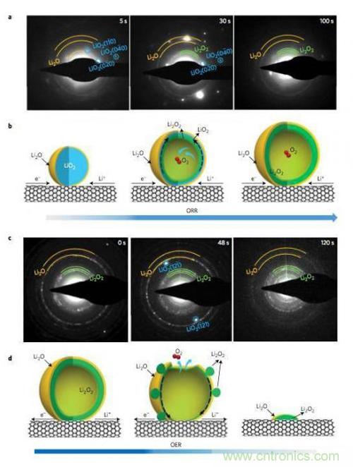 研究顯示,初始反應(yīng)產(chǎn)物L(fēng)iO2很快會發(fā)生歧化反應(yīng)生成Li2O2和O2,在顆粒內(nèi)部釋放的O2被封鎖在了顆粒的內(nèi)部,從而導(dǎo)致了顆粒成為中空結(jié)構(gòu),如下圖所示。從SAED的分析結(jié)果來看,在開始的幾秒鐘時間內(nèi),反應(yīng)產(chǎn)物中只有LiO2,30秒之后,Li2O2和LiO2開始共存,大約100s后LiO2的衍射峰消失,反應(yīng)產(chǎn)物只剩下Li2O2和Li2O,TEM分析結(jié)果顯示中空球的外側(cè)為Li2O,內(nèi)側(cè)為Li2O2。充電過程則正好相反,開始的時候觀察到了Li2O和Li2O2的衍射峰,在48s時出現(xiàn)了LiO2的衍射峰,但是在120s時并沒有再出現(xiàn)LiO2的衍射峰,說明LiO2只是Li2O2分解的一個中間產(chǎn)物。整個過程為我們揭示了Li-O2電池的充放電反應(yīng)途徑,在放電的時候,Li+通過電解液擴(kuò)散到CNT表面,在三相界面發(fā)生反應(yīng),生成LiO2,然后LiO2發(fā)生歧化反應(yīng)(LiO2?Li2O2+O2),生成Li2O2和O2,反應(yīng)釋放的O2會將反應(yīng)產(chǎn)物從最初的10nm左右,吹到100nm左右,而在產(chǎn)物的表面由于有豐富的Li+,因此會與O2反應(yīng)生成Li2O。在充電的過程中,Li2O2首先會失去一個Li+和一個電子,形成LiO2,隨后LiO2發(fā)生分解,產(chǎn)生Li2O2和O2,然后Li2O2再次失去Li+和電子,如此循環(huán)指導(dǎo)所有的Li2O2消耗完畢。