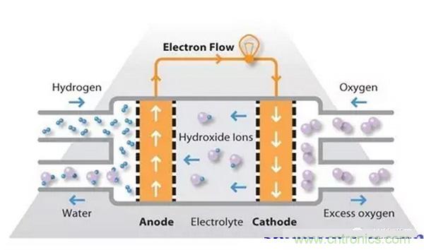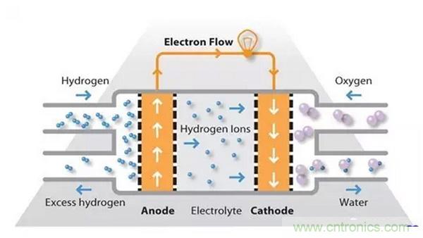 氫燃料在陽極處被處理,其中電子與鉑基催化劑的表面上的質(zhì)子分離。質(zhì)子通過膜到達電池的陰極側(cè),同時電子在外部電路中行進,產(chǎn)生電池的電輸出。在陰極側(cè),另一個貴金屬電極將質(zhì)子和電子與氧氣結(jié)合以產(chǎn)生水,其作為唯一的廢物排出;氧可以以純化形式提供,或者在電極處直接從空氣中提取。