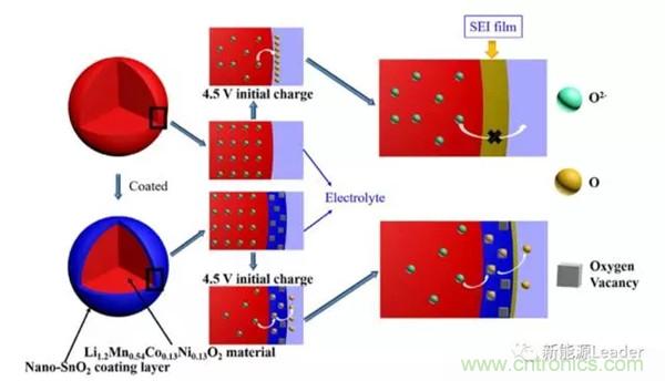 富鋰材料界面穩(wěn)定性差,容易導(dǎo)致副反應(yīng)的發(fā)生,影響電池的循環(huán)壽命,一種有效的解決辦法就是“表面包覆”,例如AlF3、Al2O3和Li3PO4等材料都可以用于富鋰材料的表面包覆,改善富鋰材料的表面穩(wěn)定性。哈工大的杜春雨等等提出了一種SnO2包覆方案,他們利用了SnO2中的氧缺位,促進(jìn)Li2MnO3結(jié)構(gòu)的形成,不僅改善了富鋰材料的循環(huán)性能和倍率性能,還提高了富鋰的材料的容量,達(dá)到了264.6mAh/g,相比于沒有包覆處理的富鋰材料提高了38.2mAh/g,這也為富鋰材料表面改性處理提供了一個(gè)新的思路。