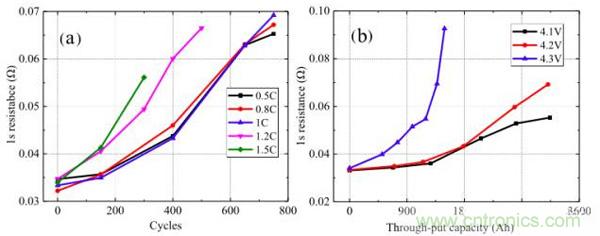 對(duì)電池的動(dòng)態(tài)內(nèi)阻分析如下圖所示,從圖a測(cè)試結(jié)果來(lái)看,當(dāng)充電電流小于1C時(shí),電池動(dòng)態(tài)內(nèi)阻隨著電池循環(huán)的變化趨勢(shì)幾乎時(shí)一樣的,但是當(dāng)充電電流超過(guò)1C時(shí),電池動(dòng)態(tài)內(nèi)阻增加速度會(huì)隨著充電速率的增加而快速增加。從圖b的測(cè)試結(jié)果來(lái)看,當(dāng)充電截止電壓為4.3V時(shí),電池動(dòng)態(tài)內(nèi)阻增加非常迅速表明高截止電壓會(huì)惡化電池的動(dòng)力學(xué)條件,截止電壓為4.1V和4.2V時(shí)電池動(dòng)態(tài)內(nèi)阻增加較為緩慢。