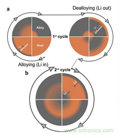 在第1次合金化過(guò)程中,Li+首先進(jìn)入從活性物質(zhì)顆粒表面,產(chǎn)生濃度差。然后以進(jìn)一步向顆粒內(nèi)部擴(kuò)散,形成Li+濃度梯度分布。但是,顆粒內(nèi)部仍有Li+難以到達(dá)的區(qū)域;