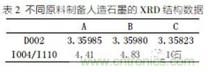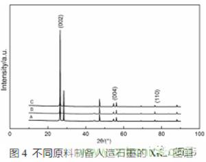 圖4是不同原料、相同制備工藝制成的三種人造石墨A、B、C的XRD圖譜,由圖4可知:A、B、C三種材料的主峰位置基本相同,均位于26°2θ角附近,說明經過高溫石墨化處理后的A、B、C三種材料形成了石墨晶體的六方晶型結構。