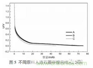 在扣電體系下,對電極為金屬鋰,放電工步對應的是嵌鋰工步。圖5為不同原料人造石墨的在大電流(2C)下的嵌鋰曲線圖。從曲線圖上可以看出:A的嵌鋰平臺最高。由XRD數(shù)據(jù)可知A的各項同性性能較好。
