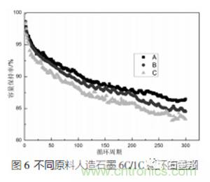 圖6為不同原料人造石墨倍率循環(huán)曲線圖。在6C/1C測試條件下,A材料的300周容量保持率為86.45%,倍率循環(huán)性能表現(xiàn)最好。