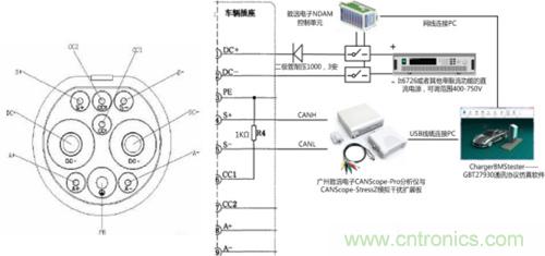 · K5、K6控制單元:驅(qū)動(dòng)上述繼電器,與協(xié)議模擬器配合,在充電過程進(jìn)入充電配置階段時(shí)實(shí)現(xiàn)繼電器吸合,進(jìn)而使充電樁檢測到模擬電池電壓。本文推薦選擇致遠(yuǎn)電子的NDAM-9000與NDAM-2808組成的控制單元,可以通過網(wǎng)口與CANScope實(shí)現(xiàn)聯(lián)動(dòng)。