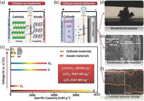 c)典型電極材料在電壓和容量方面的比較,LMBs的能量密度遠(yuǎn)大于LIBs;