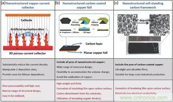 鋰粉末和表面改性的鋰箔可以作為平面鋰箔的替代物,以延遲枝晶的產(chǎn)生。負(fù)極的表面積大大增加以提供相當(dāng)大的沉積位置,從而在一段時(shí)間內(nèi)抑制枝晶生長。然而,鋰箔的表面狀態(tài)和粉末之間的邊界不會(huì)持續(xù)很長時(shí)間,并且整個(gè)箔在長時(shí)間循環(huán)中會(huì)變成隨機(jī)分散的鋰微結(jié)構(gòu)的聚集體。相比之下,集流體(CCs)方法取得了較好的表現(xiàn),傳統(tǒng)銅箔被納米結(jié)構(gòu)化的材料代替。之后為了避免納米結(jié)構(gòu)銅的缺點(diǎn),開發(fā)了碳涂覆的銅箔,這些碳涂層都貢獻(xiàn)了更好的電化學(xué)性能,這與其優(yōu)異的導(dǎo)電性、高比表面積和合適的孔徑/體積比具有密切的關(guān)系。與納米結(jié)構(gòu)或碳涂層銅箔相比,自支撐碳膜本身可直接作為CCs,能夠避免有機(jī)粘合劑或碳脫落產(chǎn)生的導(dǎo)電性所帶來的不利影響。