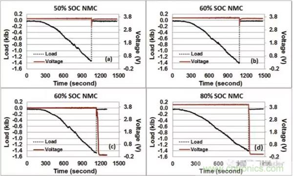 在對25Ah的NMC電池擠壓-扭轉測試中,發(fā)現(xiàn)50%SoC狀態(tài)下的電池都成功通過了測試,如圖a所示,60%SoC狀態(tài)下的電池有三只通過了測試,如圖b所示,另外的三只沒有通過測試,如圖c所示,可見60%SoC的電池通過測試和不通過測試的概率各為50%,而80%SoC的電池則都沒有通過測試,如圖d所示。由此可見,60%SoC是NMC電池安全性的一個分水嶺,低于這個數(shù)值時電池相對是安全的,高于這個數(shù)值,則電池在機械濫用的情況下的安全性將大大下降。