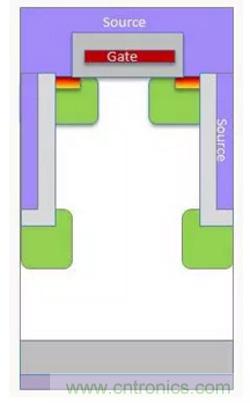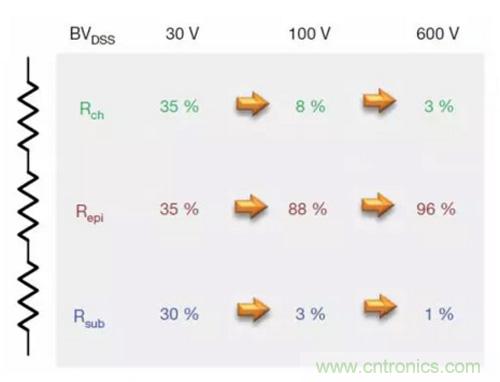 圖2顯示平面式MOSFET情況下構(gòu)成RDS(on) 的各個(gè)分量。對(duì)于低壓MOSFET,三個(gè)分量是相似的。但隨著額定電壓增加,外延層需要更厚和更輕摻雜,以阻斷高壓。額定電壓每增加一倍,維持相同的RDS(on)所需的面積就增加為原來的五倍以上。對(duì)于額定電壓為600V的MOSFET,超過95%的電阻來自外延層。顯然,要想顯著減小RDS(on)的值,就需要找到一種對(duì)漂移區(qū)進(jìn)行重?fù)诫s的方法,并大幅減小epi電阻。