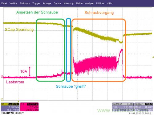 圖5顯示了測(cè)量得出的電鉆及電動(dòng)螺絲刀工作循環(huán)。帶有短時(shí)脈沖和極具波動(dòng)特點(diǎn)的工作電流(圖中的Imax約25A,根據(jù)電鉆及電動(dòng)螺絲刀具體情況也可最高達(dá)到85A)可與電池輸出電流完全隔離,以便電池始終能在其定義的舒適區(qū)域運(yùn)行(典型的穩(wěn)定電池電流2-3A)。同時(shí)這也會(huì)對(duì)其使用壽命產(chǎn)生持續(xù)性積極影響。
