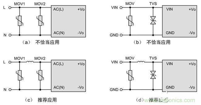 電源模塊體積小,在EMC要求比較高的場合,需要增加額外的浪涌防護電路,以提升系統(tǒng)EMC性能。如圖1所示,為提高輸入級的浪涌防護能力,在外圍增加了壓敏電阻和TVS管。但圖中的電路(a)、(b)原目的是想實現(xiàn)兩級防護,但可能適得其反。如果(a)中MOV2的壓敏電壓和通流能力比MOV1低,在強干擾場合,MOV2可能無法承受浪涌沖擊而提前損壞,導致整個系統(tǒng)癱瘓。同樣的,電路(b),由于TVS響應(yīng)速度比MOV快,往往是MOV未起作用,而TVS過早損壞。
