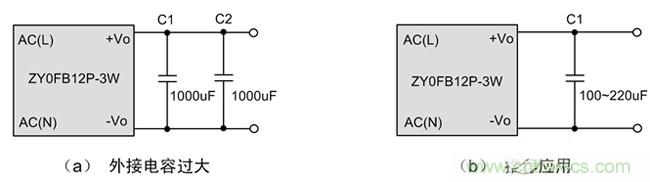 如圖2中的電路(a)所示,一個3W的模塊,輸出使用了2000uF的電容,而通過查閱產(chǎn)品手冊了解到,模塊建議最大輸出電容為800uF。輸出電容過大可能導致啟動不良,而對于不帶短路保護的微功率DC-DC模塊,輸出電容過大甚至可能導致模塊永久損壞。