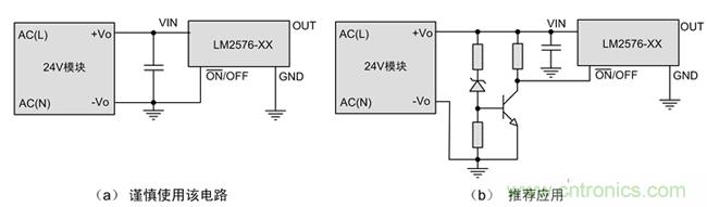 因此推薦使用電路(b),外置簡單的欠壓鎖定,使24V模塊輸出電壓建立到預置值后再啟動LM2576等外接開關(guān)電源芯片,可以很大程度上避免啟動不良問題。