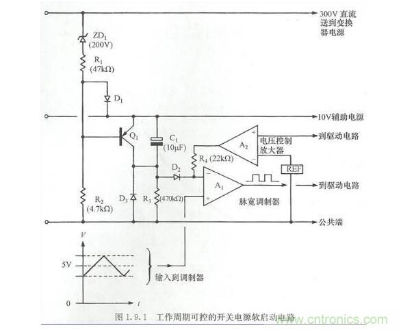 當首次接上開關電源時,C1將放電。10V開關電源線上逐漸增大的電壓將使放大器A1反相輸入端為正,禁止脈寬調制器的輸出。晶體管Q1將通過R2導通,保持C1放電狀態(tài)直到送到變換器電路的300V直流線上形成的電壓超過200V。
