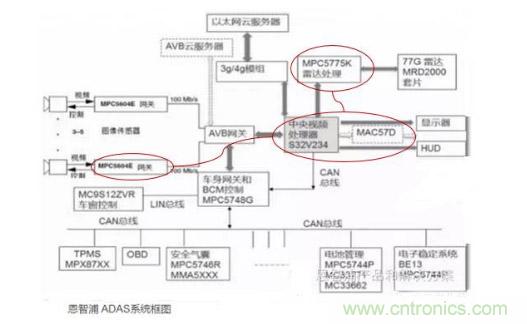 NXP已經(jīng)發(fā)布Blubox平臺,為OEM廠商提供設計、制造、銷售Level 4級(SAE)無人駕駛汽車的解決方案計算平臺。下圖是NXP的ADAS系統(tǒng)框圖,該系統(tǒng)對多路視頻、77G雷達的數(shù)據(jù)進行融合處理,然后傳送給云端和車身系統(tǒng)。我們看到NXP是能夠提供全套Reference方案的公司,在這一塊的產(chǎn)品線很全,雖然現(xiàn)在沒有做更多的芯片集成,而是提供相對分散的芯片及解決方案。我們這里重點介紹一下中央處理器S32V234和MPC5775K,MPC5775K是對雷達數(shù)據(jù)進行處理,而S32V234是對多傳感器處理過的數(shù)據(jù)進行融合分析,通過CAN總線,把結(jié)果傳給車身系統(tǒng)。