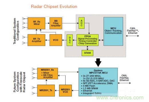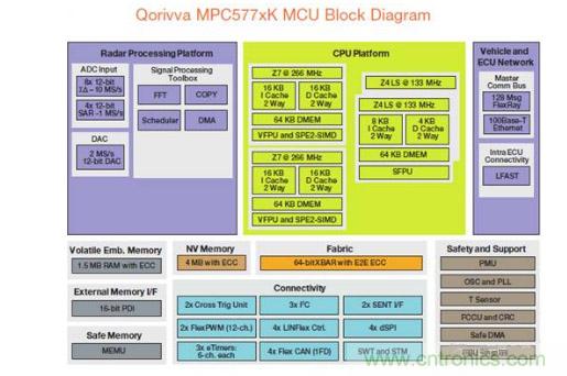 QorivvaMPC567xK系列基于Power Architecture® 的32位MCU,MPC577XK是專門的雷達信息處理芯片,該系列增加了芯片的存儲器,提升了運行速度和性能,能夠支持自適應巡航控制、智能大燈控制、車道偏離警告和盲點探測等應用。從整個雷達系統(tǒng)來看,結(jié)合77G雷達收發(fā)器芯片組、Qorivva MPC567xK MCU、FPGA, ADC, DAC, SRAM, 支持長、中、短距離應用。這里需要重點關注的是信號處理工具集(Signal Processing Toolbox)設計,包括了FFT、DMA、COPY、Scheduler。目前77GHz的FCMW型雷達在數(shù)字信號處理中需要使用FFT,即快速傅里葉變換,一般車載雷達的采樣點在512-2048左右,從芯片架構(gòu)圖我們看到專門的FFT電路。