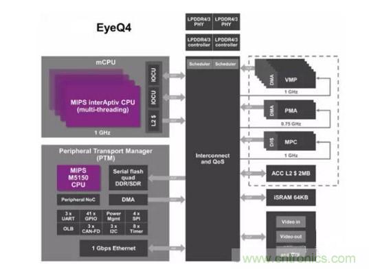 其中特別要指出的是Mobileye的EyeQ系列,已經(jīng)被多家汽車制造商使用,包括奧迪、寶馬、菲亞特、福特、通用、本田、日產(chǎn)、標致、雪鐵龍、雷諾、沃爾沃和特斯拉等在內(nèi)。最近的EyeQ4展示的性能已經(jīng)達到2.5 萬億次每秒的性能,其運行功率可低至3W。從硬件架構(gòu)來看,該芯片包括了一組工作在1GHZ的工業(yè)級四核MIPS處理器,以支持創(chuàng)新性的多線程技術(shù)能更好的進行數(shù)據(jù)的控制和管理。多個專用的向量微碼處理器(VMP),用來應對ADAS相關的圖像處理任務(如:縮放和預處理、翹曲、跟蹤、車道標記檢測、道路幾何檢測、濾波和直方圖等)。一顆軍工級MIPS Warrior CPU位于次級傳輸管理中心,用于處理片內(nèi)片外的通用數(shù)據(jù)。