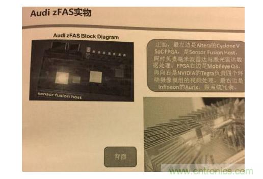 由于目前融合多是雷達與攝像頭融合,所需要的帶寬,一般的ASIC都能夠滿足。但是要融合激光雷達,則最好用FPGA,F(xiàn)PGA做傳感器Hub是最合適不過的。同時傳感器融合目前應用較少,合適的ASIC并不好找,F(xiàn)PGA成為主流選擇。同時,對一些精度要求較高的雷達,如使用單精度浮點處理實現(xiàn)一個4096點FFT,采樣點越多,誤差就越小,但運算量會大幅度增加。它在每個時鐘周期輸入輸出四個復數(shù)采樣。每個FFT內(nèi)核運行速度超過80 GFLOP,這一般需要FPGA才能比較好的實現(xiàn)。一般車載雷達的采樣點在512-2048左右,但軍用的可以達到8192,必須配備FPGA。如下圖在AudizFAS的實物中,采用了Altera的CycloneV SoCFPGA,作為sensor fusion,同時負責毫米波雷達與激光雷達數(shù)據(jù)處理。
