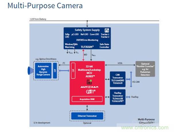 Visiconti采用多核異構(gòu)的專用處理器,Visconti2可實時處理,并行實現(xiàn)4項功能,如車道保持、前車檢測、行人辨識、交通標志辨識。Visconti4圖像識別處理器可輕松對車輛和行人加以辨識,對交通信號、障礙物、行車線等信息加以識別,從而實現(xiàn)各種高級的駕駛員輔助應用,如入車道偏離警告、前方/后方防撞警告、前方/后方行人防撞警告、交通標識識別等,能同時處理并實現(xiàn)8項功能。