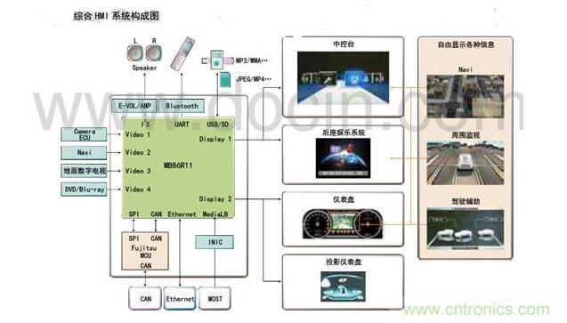 富士通的ADAS技術(shù)主要涉及透過攝像頭和傳感器的結(jié)合,實現(xiàn)圖像識別輔助和接近目標檢測,應用的領域主要有360度3D立體全景輔助、可視停車輔助、駕駛盲區(qū)監(jiān)控、安全開車門以及車行駛方向周圍的障礙物和行人的識別。包括基于MB86R11“Emerald-L”2D/3D圖像SoC的全景視頻系統(tǒng)支持前后左右四個攝像頭進行汽車周邊環(huán)境的實時全景視頻監(jiān)測。從公開資料顯示,富士通似乎更熱衷于虛擬儀表盤及車載信息娛樂系統(tǒng)的構(gòu)建,但這一塊是最容易被國內(nèi)芯片公司模仿并超越的。