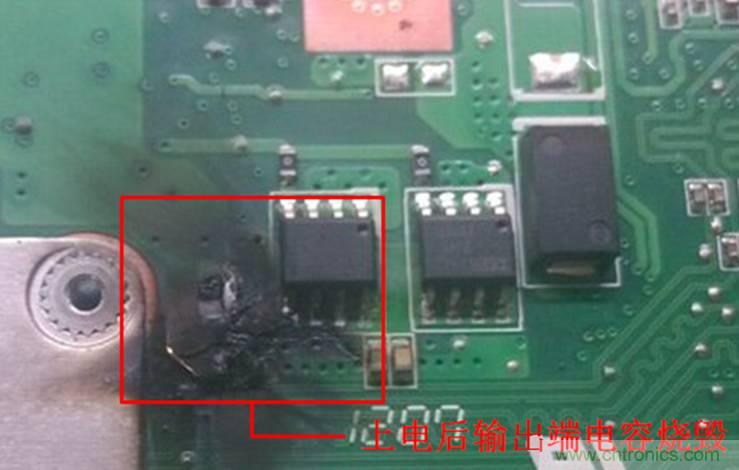 較于上一種電源模塊損壞的情況而言,更可怕的情況就是,不僅壞了電源甚至把整個(gè)電路都燒毀了。具體的現(xiàn)象就是電源模塊剛上電就燒毀冒煙了,輸入端的電容炸裂,如圖3所示,這一類問(wèn)題是最為嚴(yán)重的,需要在前期設(shè)計(jì)中盡量避免,那么若是已經(jīng)發(fā)生了這一情況,它到底是什么原因?qū)е碌哪??具體如下所示: