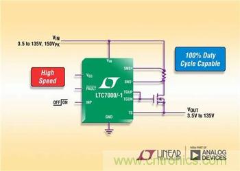 LTC7000是一款快速、高壓側(cè) N 溝道 MOSFET 柵極驅(qū)動器,主要接收一個參考于地的低電壓數(shù)字輸入信號,并以 35ns 的傳播延遲完全接通或關(guān)斷一個其漏極可高出地電位達 135V 的高壓側(cè) N 溝道 MOSFET。13ns的快速上升和下降時間 (當(dāng)驅(qū)動一個 1000pF 負載) 最大限度降低了開關(guān)損耗。其內(nèi)部充電泵全面強化一個外部 N 溝道 MOSFET 開關(guān),因而使之能無限期地保持導(dǎo)通。