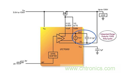 LTC7000 在 INP 引腳上接收一個參考于地的低電壓數(shù)字信號、把該信號電平移位至高達 VIN 電壓。并控制片內(nèi)低阻抗上拉和下拉器件,能快速接通或判斷一個其漏極可高出地電位達 135V 的高壓側(cè) N 溝道 MOSFET。從低電壓 INP 信號至得到全面強化或被完全關(guān)斷的 N 溝道 MOSFET 之傳播延遲約為 35ns,這也促成了許多應(yīng)用。