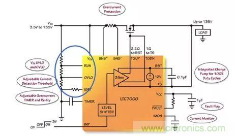 LTC7000 能夠避免負載遭受 VIN 引腳上的過壓和欠壓情況的損壞。“一個連接在 VIN 和地之間、且抽頭連接至 RUN 和 OVLO 引腳的簡單電阻分壓器將設(shè)定一個針對負載的有效操作窗口。當(dāng) VIN 位于由 RUN 和 OVLO 引腳所設(shè)定的操作窗口之外時,則關(guān)斷外部 MOSFET,并保護負載免遭潛在損壞或發(fā)生故障。” Mark Mullen這樣談到。