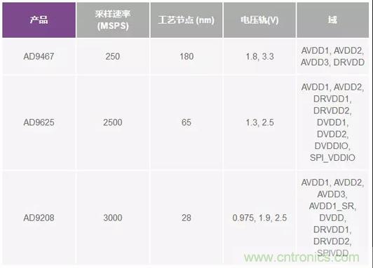 數(shù)字電路不需要裕量,因為最重要的參數(shù)是速度。所以,數(shù)字電路通常以最低電源電壓運行,以獲取CMOS開關速度和功耗的優(yōu)勢。這在新一代ADC中很明顯,最低電壓軌已降低至0.975 V。下面的表1列出了若干代的一些常見ADC。