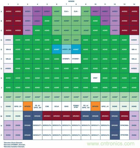 顯示AD9208各不同域的引腳排列圖如圖1所示。