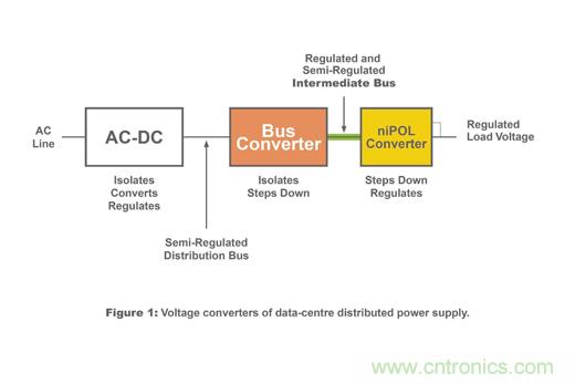 圖字:交流線(xiàn)路;隔離、轉(zhuǎn)換、穩(wěn)壓;半穩(wěn)壓配電總線(xiàn);總線(xiàn)轉(zhuǎn)換器;隔離、降壓;穩(wěn)壓半隔離中間總線(xiàn);niPOL轉(zhuǎn)換器;降壓、穩(wěn)壓;穩(wěn)定負(fù)載電壓