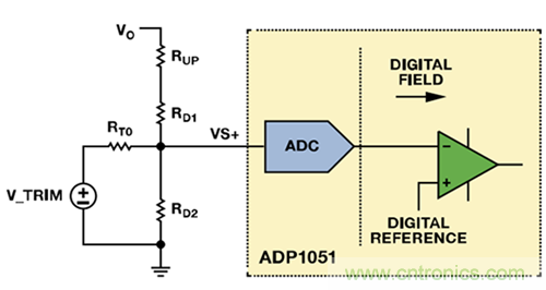 VS+引腳上的正常工作電壓為1 V。若VTRIM為1 V左右且RT0遠(yuǎn)大于RD2,則可忽略電路的其余分支部分。復(fù)合網(wǎng)絡(luò)用作簡單分壓器,并調(diào)節(jié)RUP電阻值,提供類似于模擬控制器的特性,實(shí)現(xiàn)了模擬電源模塊中的電壓向上調(diào)整。