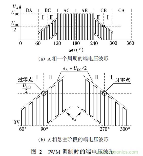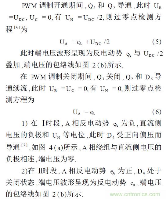 【導讀】分析了上橋臂PWM 調制、下橋臂恒通調制方式時的端電壓波形,討論相應的反電動勢過零點檢測方法。在PWM 調制信號開通狀態(tài)結束時刻對端電壓進行采樣,由軟件算法確定反電動勢過零點. 針對電機運行時存在超前換相或滯后換相的情況,通過設置合理的延遲時間來實現(xiàn)最佳換相。
