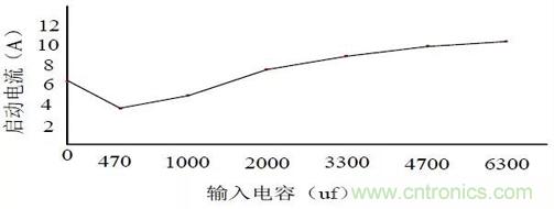 從理論上講,增大電路中的濾波電容 C容量的確可以使輸出電壓的波形變得更為平滑、起伏更小,但在電路接通瞬間,電路中所產(chǎn)生的沖擊電流因素卻不能被忽略;在一些濾波電路的維修中對濾波電容的替換也存在沖擊電流的問題,在不更換其他元件的前提下,單純提高濾波電容的容量會使整個電路的實際使用壽命大大縮短,甚至燒毀整個電路。況且,單純地提高濾波電容的容量對改善輸出電壓的作用也是有限的。做一個簡單實驗外接不同輸入電容的大小啟動時的電流曲線,如下圖所示為輸入外接電容大小與啟動電流的關(guān)系曲線。