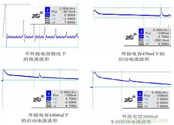 上圖為外接電容大小不同的啟動電流波形。外接電容在一定情況下,啟動電流達(dá)到最低值,對整個電路的輸入,輸出環(huán)境有很大的改善。當(dāng)外接電容超過這個范圍就會導(dǎo)致啟動電流增大,對其他器件的威脅也就隨之增大,導(dǎo)致出現(xiàn)不同程度的器件損壞。