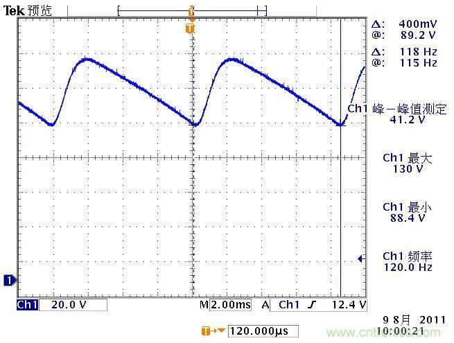 低頻紋波是與輸出電路的濾波電容容量相關。由于開關電源體積的限制,電解電容的容量不可能無限制地增加,導致輸出低頻紋波的殘留,該輸出紋波頻率隨整流電路方式的不同而不同。