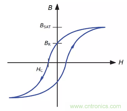 一般高頻電感所用的鐵氧體鐵芯是含有鎳鋅或錳鋅之鐵氧體化合物,屬于矯頑磁力低的軟磁類鐵磁材料。圖1為一般磁鐵芯之磁滯曲線,磁性材料的矯頑磁力HC亦稱為保磁力,系指當(dāng)磁性材料已磁化到磁飽和后,使其磁化強(qiáng)度減為零時(shí)所需的磁場強(qiáng)度。矯頑力較低代表抵抗退磁能力較低,也意味著磁滯損失較小。