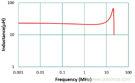 電感器之電感值在電路設(shè)計(jì)時(shí)為最重要的基本參數(shù),但必須看在工作頻率下此電感值是否穩(wěn)定。電感的標(biāo)稱值通常是在沒有外加直流偏置的條件下,以100 kHz 或1 MHz 所量得。且為確保大量自動(dòng)化生產(chǎn)的可能性,電感之容差值(tolerance)通常是 ±20%(M)與±30%(N)居多。圖3為利用表量測 電感220M 之電感-頻率特性圖,如圖所示,在5 MHz 之前電感值的曲線較為平坦,電感值幾乎可視為常數(shù)。在高頻段因寄生電容與電感所產(chǎn)生的諧振,電感值會(huì)上升,此諧振頻率稱為自我諧振頻率,通常需遠(yuǎn)高于工作頻率。