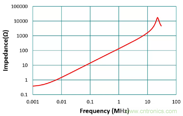 如圖4,從阻抗圖也可以看出電感在不同頻率下的表現(xiàn)。電感的阻抗約與頻率成正比(Z=2πfL),因此頻率愈高,電抗會(huì)比交流電阻大很多,所以阻抗表現(xiàn)就如同純電感(相位為90?)。而再往高頻,由于寄生電容效應(yīng),可以看到阻抗的自我諧振頻率點(diǎn),過了此點(diǎn)阻抗下降呈現(xiàn)電容性,且相位逐漸轉(zhuǎn)為-90 ?。