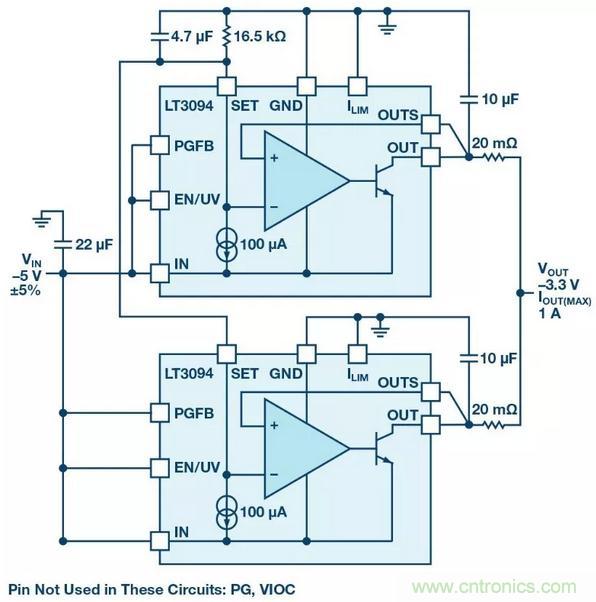 并聯(lián)多個(gè)LT3094可獲得更高的輸出電流。將所有SET引腳和所有IN引腳并在一起。使用小尺寸的PCB走線(用作鎮(zhèn)流電阻)將OUT引腳連接在一起,以均衡LT3094中的電流。也可以將兩個(gè)以上的LT3094進(jìn)行并聯(lián),實(shí)現(xiàn)更高的輸出電流和更低的輸出噪聲。輸出噪聲的降低與并聯(lián)器件數(shù)的平方根成比例。并聯(lián)多個(gè)LT3094對(duì)于在PCB上散熱也很有用。對(duì)于具有高輸入至輸出電壓差的應(yīng)用,也可以使用一個(gè)輸入串聯(lián)電阻或與LT3094并聯(lián)的電阻進(jìn)行散熱。圖4所示為并聯(lián)電路實(shí)現(xiàn)方案。